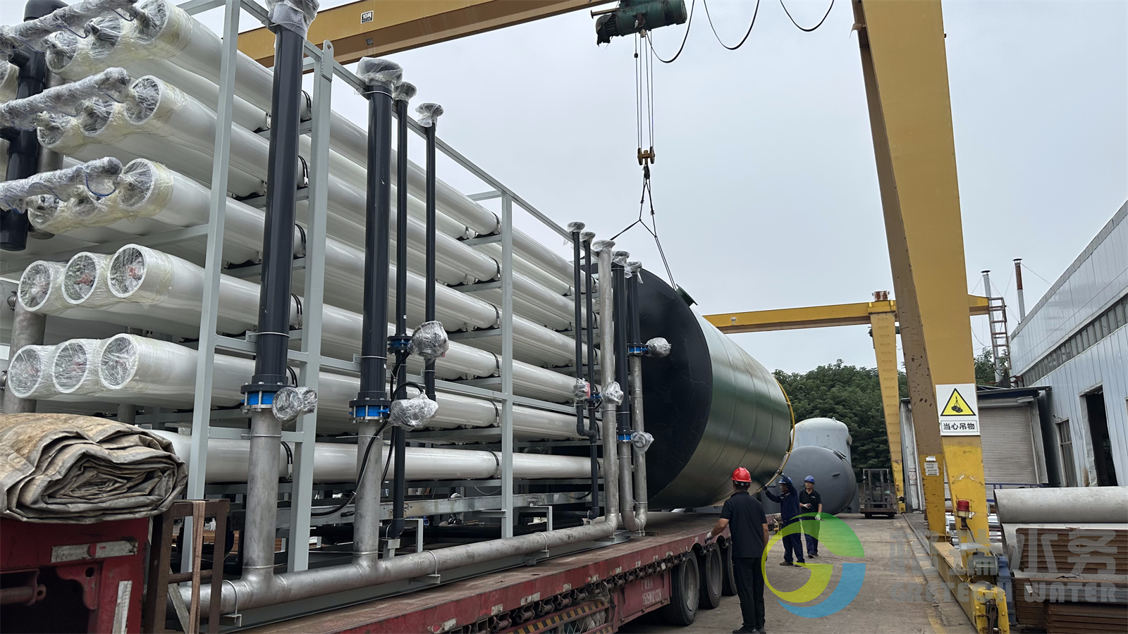 此項目為2x100t/h濃水處理系統(tǒng)設(shè)備,發(fā)貨的設(shè)備有反滲透機(jī)組、精密過濾器、保安過濾器、濃水水箱、提升泵等項目配套設(shè)備。現(xiàn)場工作人員安全有序的操作著行車裝車,裝車后大車緩緩的駛出廠區(qū)發(fā)往客戶的項目工程地。